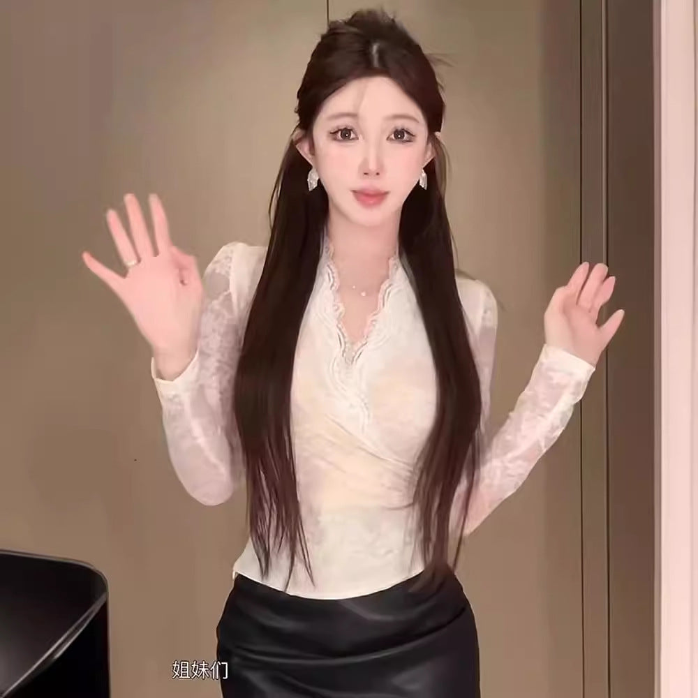 Black Long-sleeve V-neck Lace Base Top