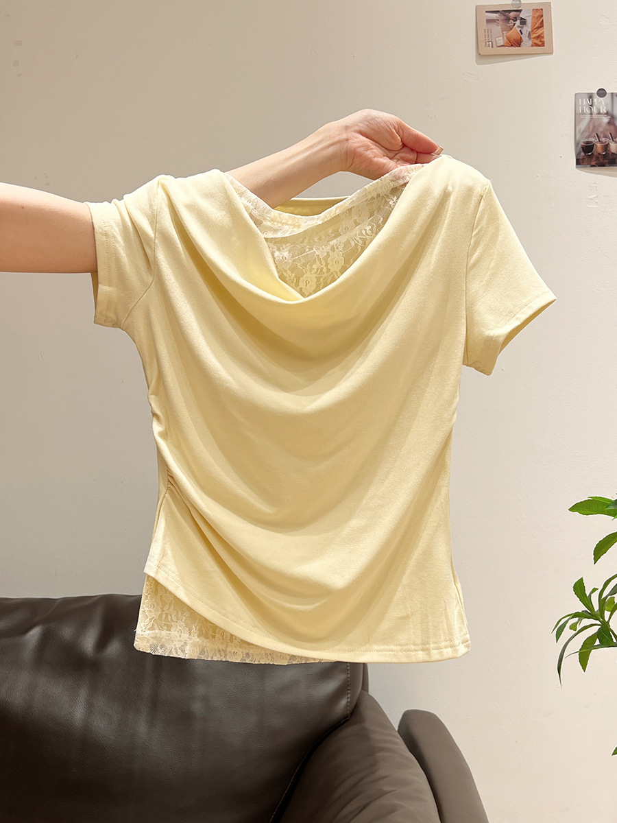 Korean Style Lace Stitching Swing Collar Off-shoulder Short Sleeve T-shirt