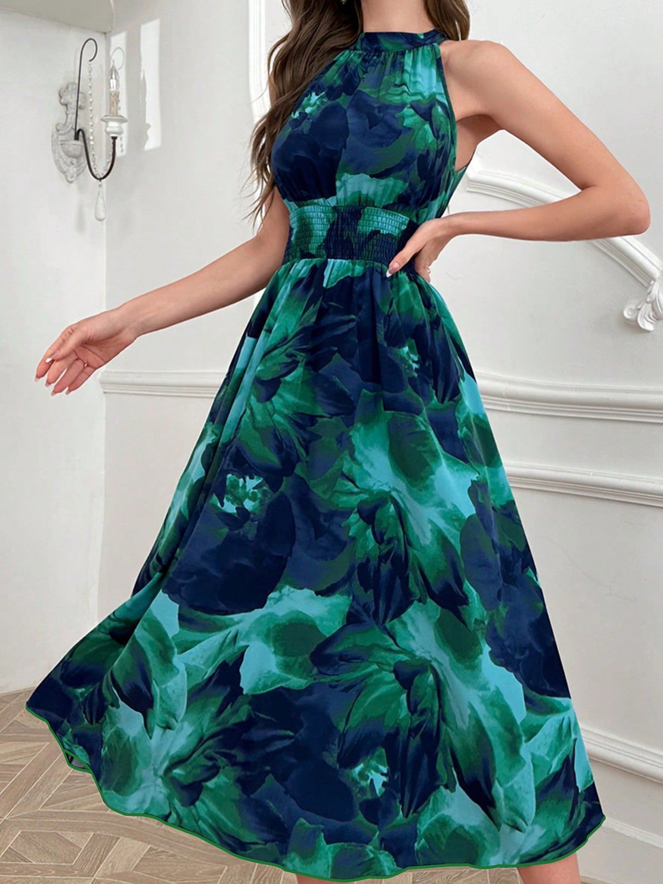 Temperament Waist-high Collar Printed Sleeveless Maxi Dress